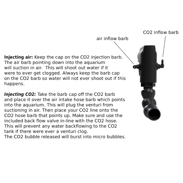 Inject air or CO2: There is an air intake for air and a second intake for CO2 injection. When injecting CO2, just use the included plug in the air intake and the venturi will burst the CO2 bubble into microbubbles.
