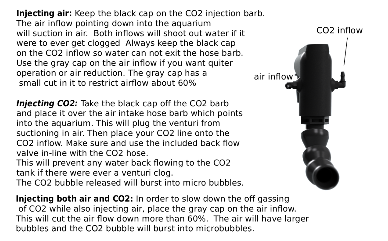 Inject air or CO2: There is an air intake for air and a second intake for CO2 injection. When injecting CO2, just use the included black cap on the air intake and the venturi will burst the CO2 bubble into microbubbles.